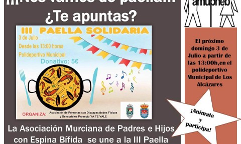 El próximo domingo 3 Julio, a partir de la 13:00h, en el polideportivo Municipal de Los Alcázares, La asociación murciana de padres e hijos con Espina Bífida se une a la III Paella solidaria de la asociación YA TE VALE ,Por el módico precio de 5 € incluye: