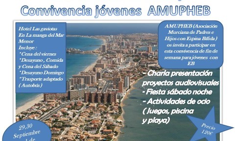 AMUPHEB (Asociación Murciana de Padres e Hijos con Espina Bífida ) os invita a participar en esta convivencia de fin de semana para jóvenes con EB 29,30 Septiembre y 1 de octubre Hotel Las gaviotas En La manga del Mar Menor Incluye : *Cena del viernes *Desayuno , Comida y Cena del Sábado