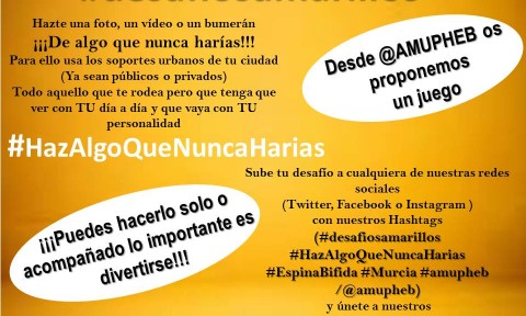 #desafiosamarillos Desde AMUPHEB os proponemos un juego #HazAlgoQueNuncaHarias Hazte una foto, un vídeo o un bumerán ¡¡¡De algo que nunca harías!!! Para ello usa los soportes urbanos de tu ciudad (Ya sean públicos o privados) Todo aquello que te rodea pero que tenga que ver con TU día a día y que vaya con